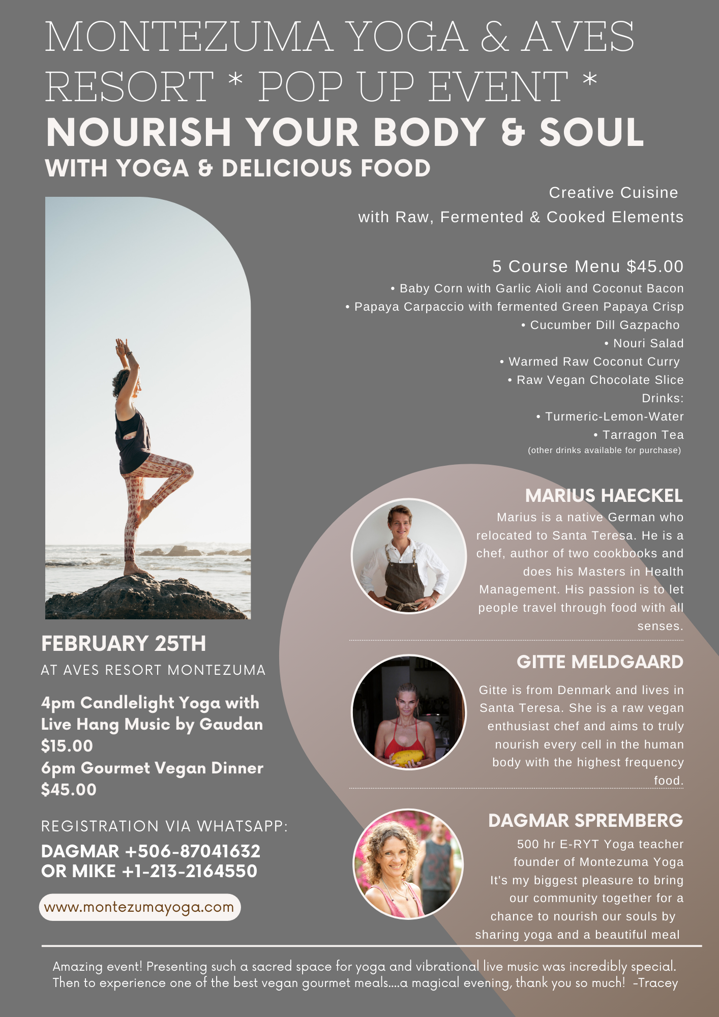 Nourish your body & soul with yoga and delicious food. This event is a collaboration between Montezuma Yoga, Aves Resort and Chef Marius Haeckel and Gitte Meldgaard. We serve a 4 course vegan/glutenfree dinner after a beautiful yoga practice with Dagmar and Gaudan, who is playing the Hang instrument during the candlelight yoga class. All parts can be booked independently or as a discounted package. Please click on event to see the full flyer with additional infos, we look forward to sharing yoga & healthy food with you.